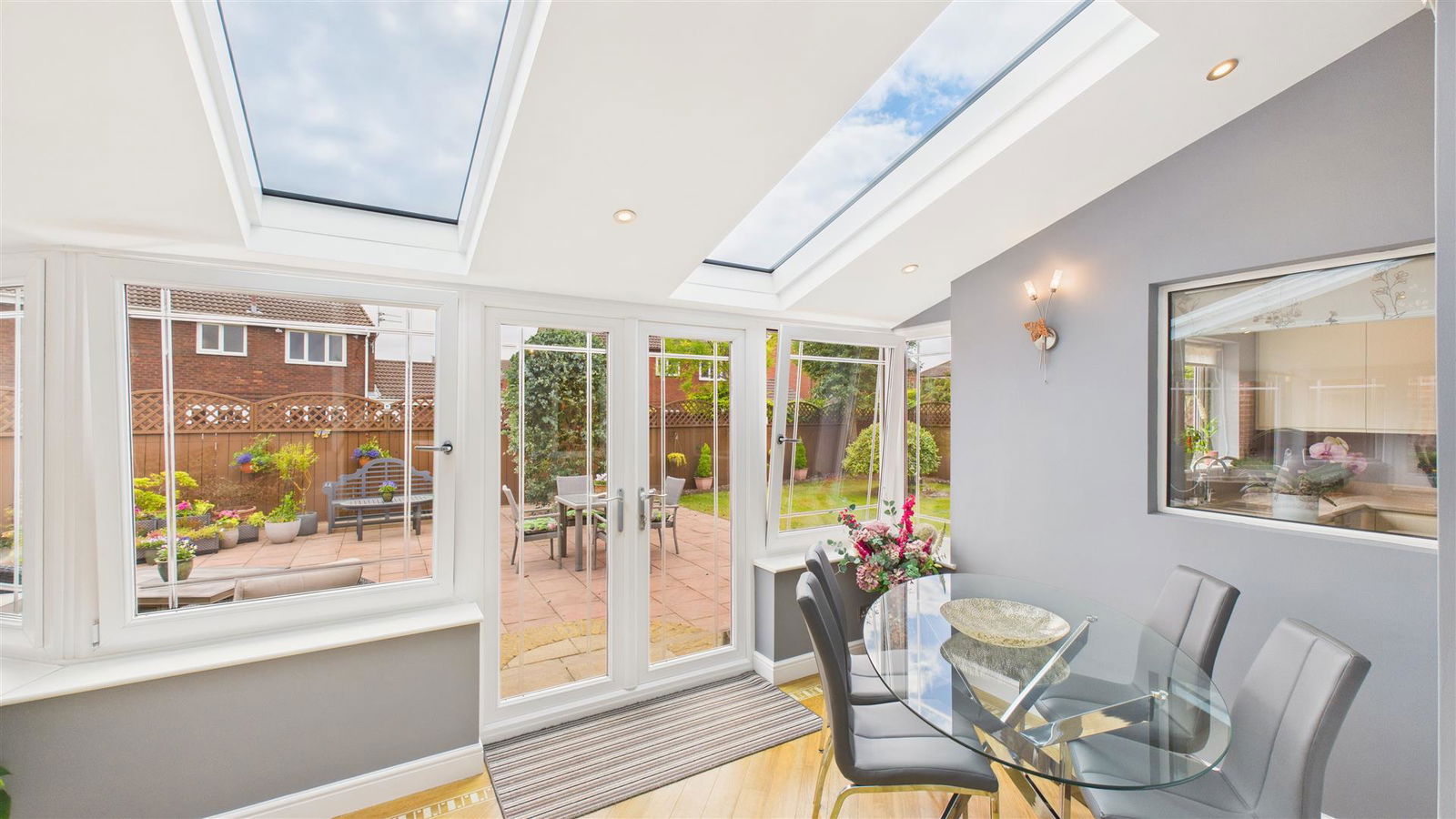 Internally the property comprises a welcoming reception hall with ground floor WC, living room, garden room, dining room, modern kitchen with island and separate utility, four well proportioned first floor bedrooms (formerly five but now with a larger en-suite bathroom) and two bathrooms, whilst externally there are beautiful gardens to the front, side and rear together with a large drive providing off street parking for up to four cars together with a detached double garage. Â