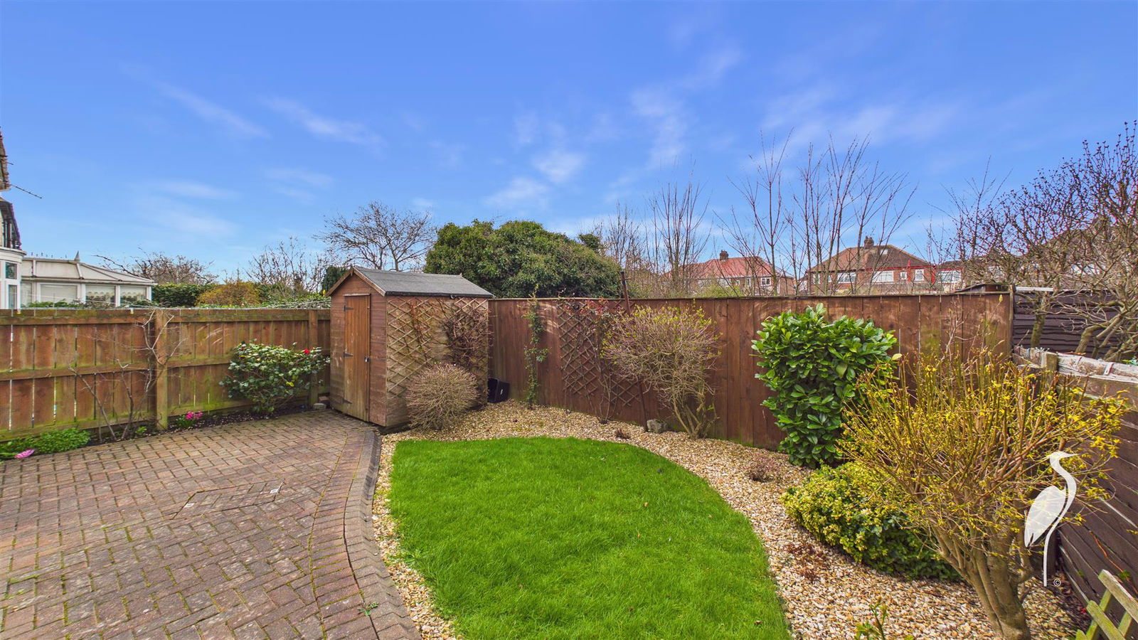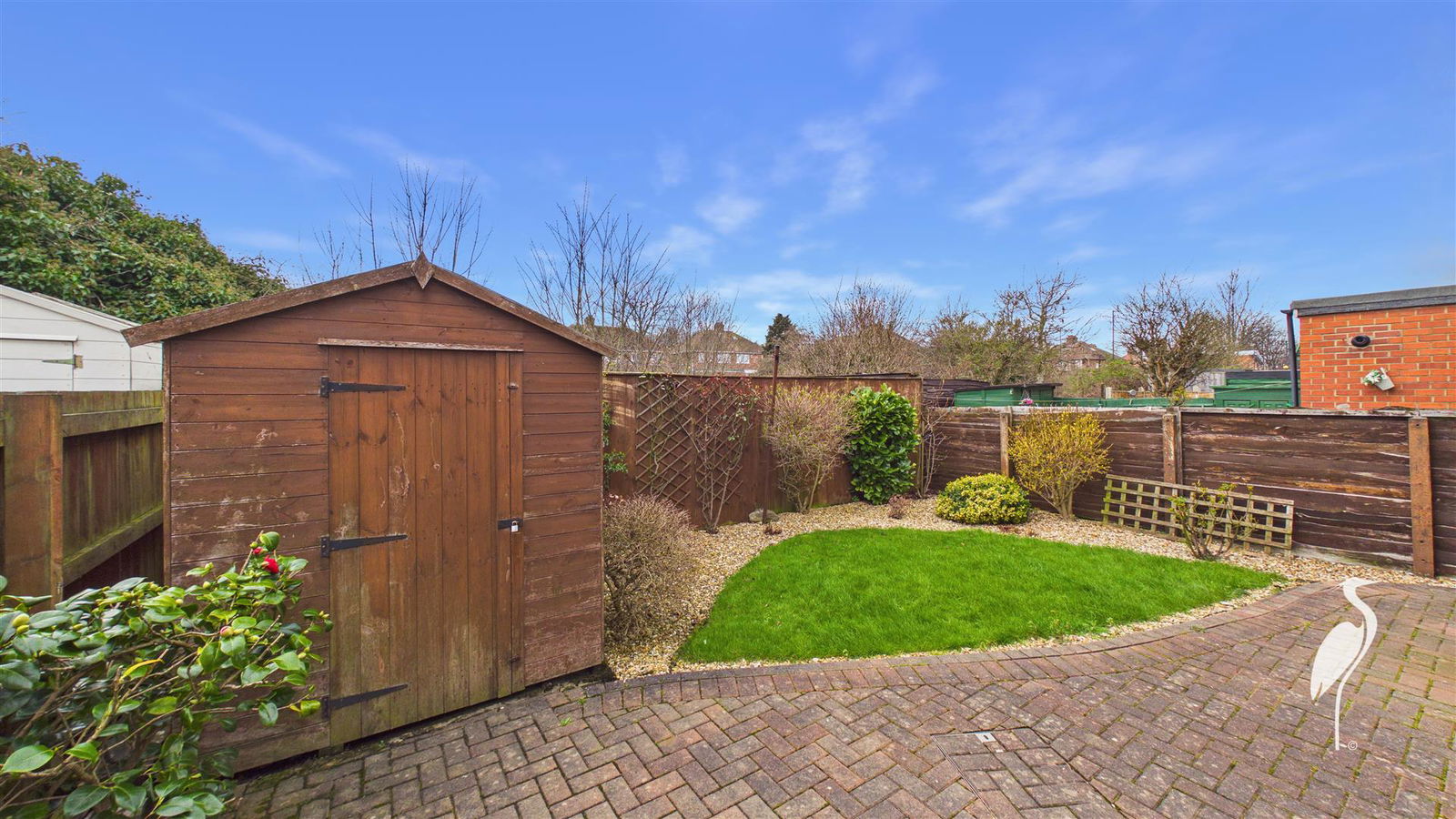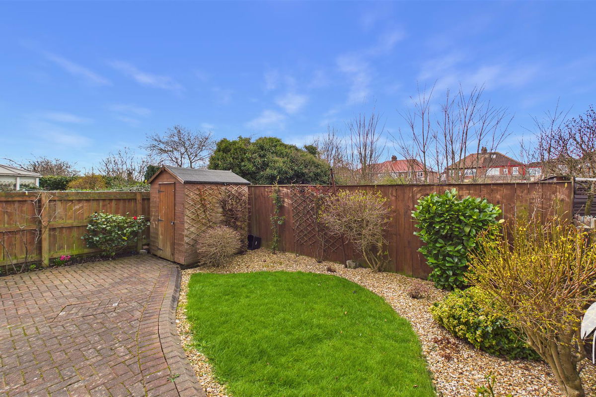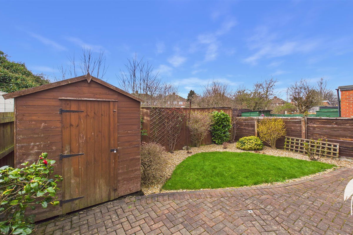 Lawned gardens to the front are accompanied by well stocked mature borders a drive and the lawned gardens to the rear benefit from a large patio seating area and impressive garden shed.